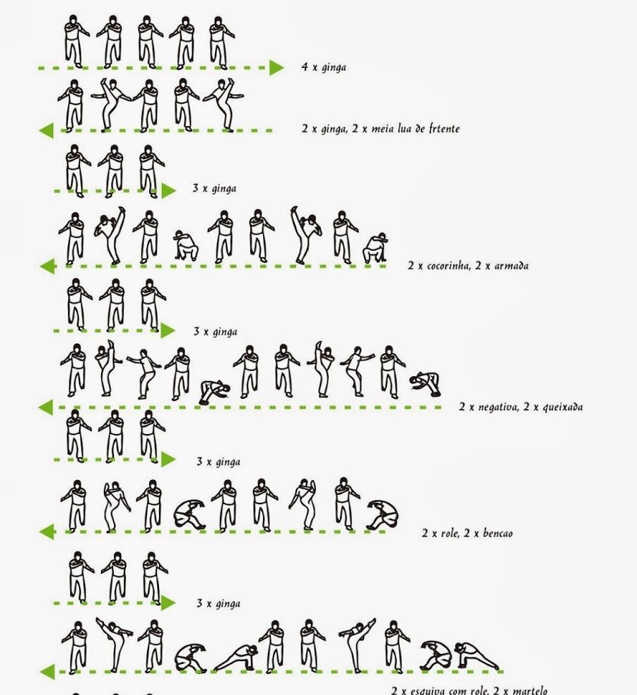 - Les déplacements qui servent à évoluer dans l’espace – « ginga » : déplacement dansé de base de la Capoeira – simples : pas chassé de côté « passada » – avec rotation « pivot », tourner sur soi « giro »