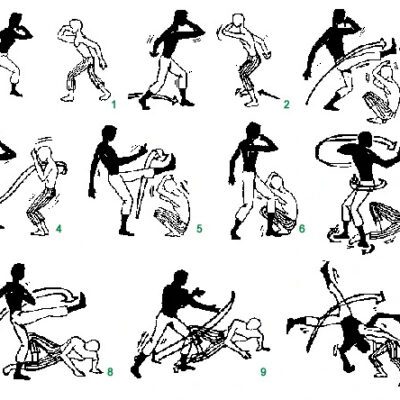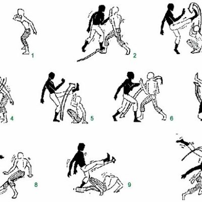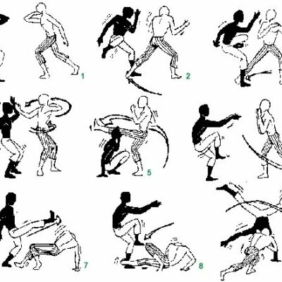 - Les acrobaties (pouvant servir d’esquive ou de déplacement) – simples : la roue « au », avec une seule main ou sans les mains – avec équilibre – avec appui au sol (dont certaines se retrouvent en hip-hop)